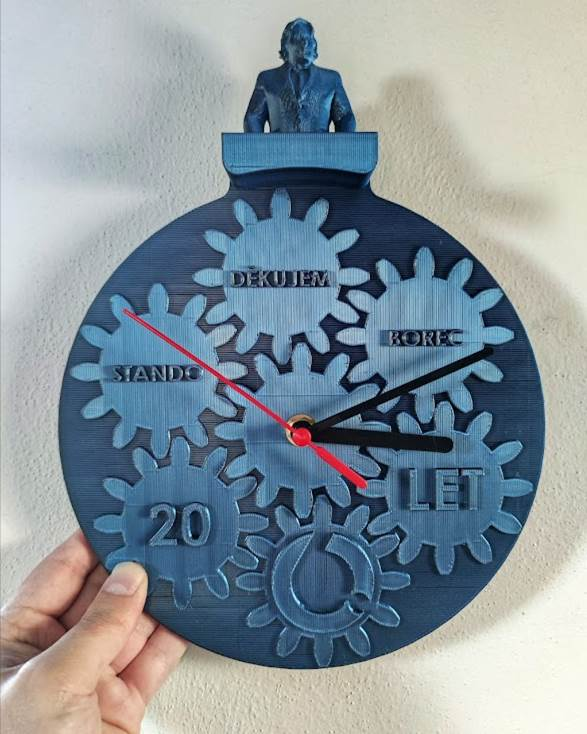 Jako poděkování za jeho dlouholetý přínos mu jeho tým věnoval dárek na míru – hodiny v designu firmy s vlastní sochou a originálním přáním, vyrobené přímo u nás.